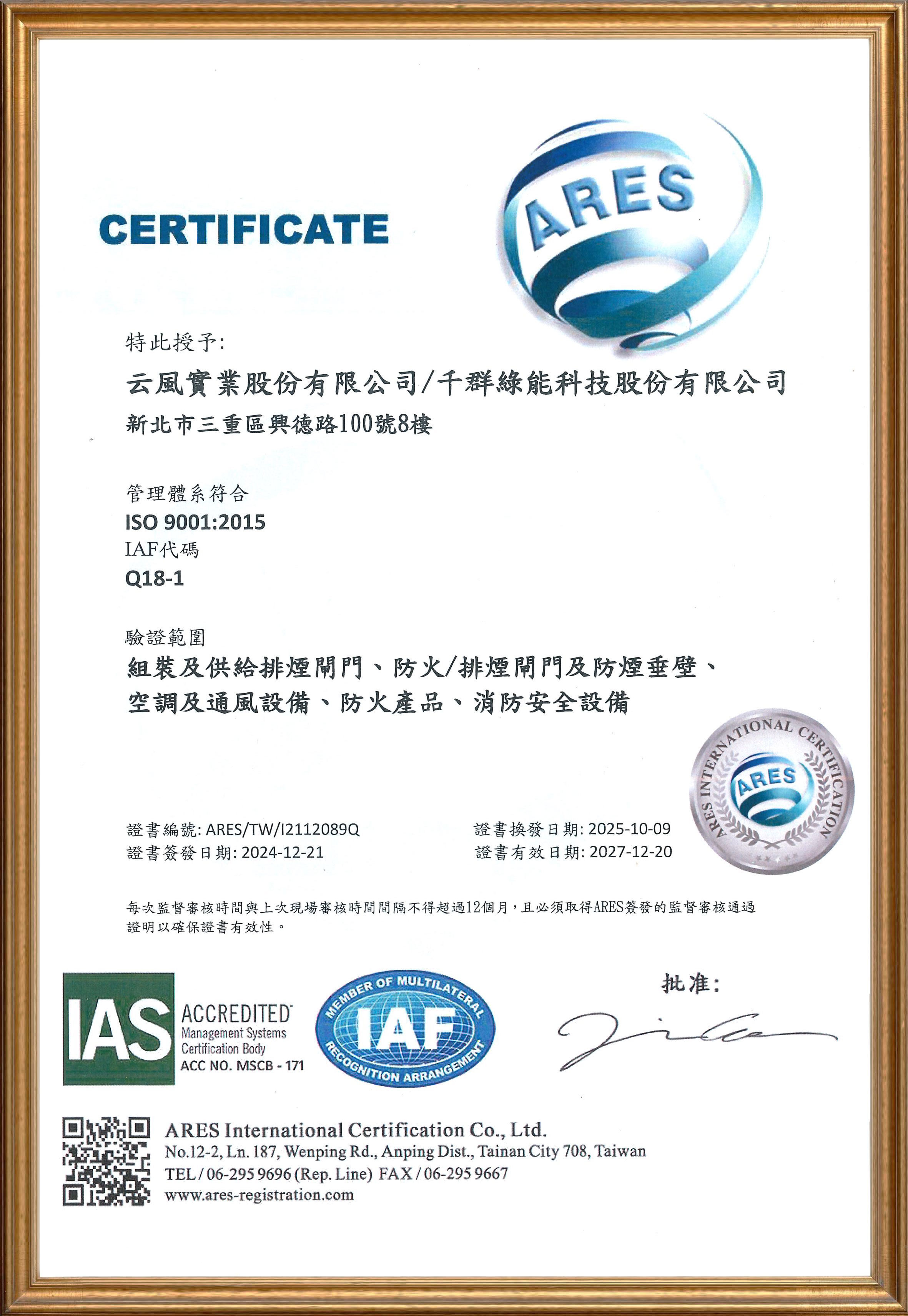 云風實業股份有限公司,管理體系符合ISO 9001:2015